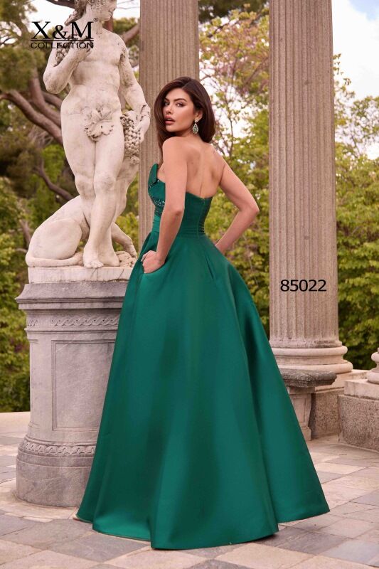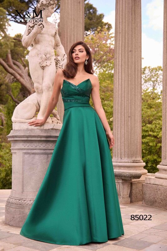 Fantástico vestido largo de fiesta confeccionado en mikado. Lleva un destacado escote de palabra de honor con terminaciones en pico y combinaciones en dos tejidos, su falda larga es de capa. Un modelo muy original y estiloso para aquellas personas que quieran deslumbrar en su evento especial. De la firma de X&M.