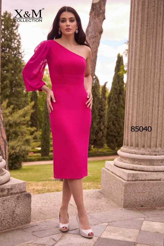 Estiloso vestido midi de fiesta confeccionado en crepé. Lleva un escote asimétrico con una manga sí y la otra no, la manga es de gasa abullonada, el vestido es entallado y recto con una abertura en la parte de atrás de la falda. Un modelo sencillo y juveniol de líneas rectas, con el que te sentirás muy cómoda en cualquier evento de día que tengas. De la firma de X&M.
