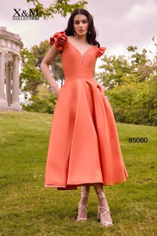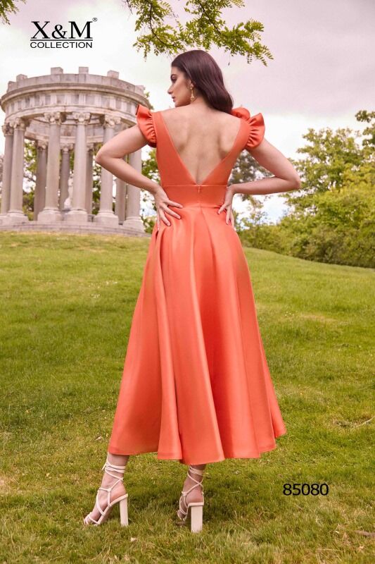 Deslumbrante vestido midi de cóctel confeccionado en mikado. Lleva un escote y espalda en forma de V, unos graciosos volantitos en el hombro y una falda de vuelo muy estilosa. Un modelo sencillo y elegante para cualquier evento de diurno o nocturno que tengas. De la firma de X&M.