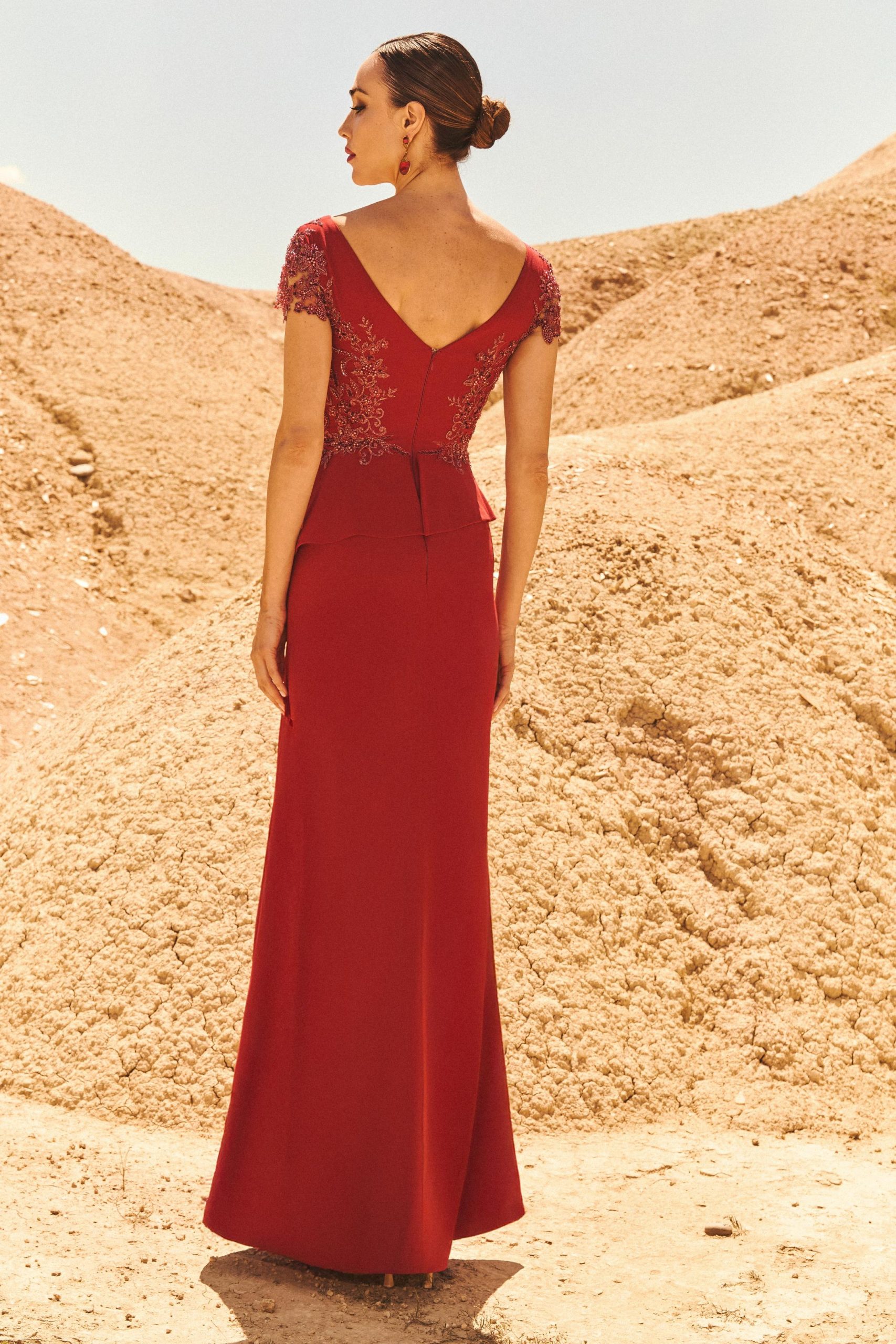 Espectacular vestido largo de madrina confeccionado en crepé satinado. Lleva un escote y una espalda en forma de V, un cuerpo bordado y unas mangas cortas. En su falda vemos un asimétrico peplum encima de una entallada falda desde la cadera y como se va abriendo hacia abajo. Un modelo elegante y sofisticado con el que las madrinas destacarán en su día. De la firma Española XYM.
