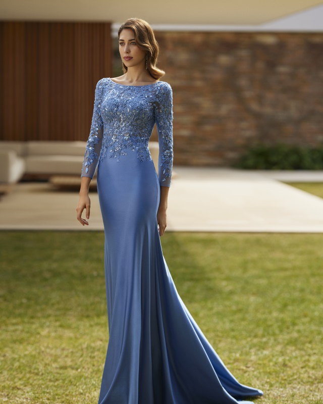 Espectacular vestido largo de madrina confeccionado de encaje, pedrería y crepé. Lleva el escote de barco, la espalda en V y unas bonitas mangas, todo ello de encaje y pedrería; la falda lisa, va entallada hasta las caderas y luego con un bonito godé se abre en el bajo. Un modelo elegante y distinguido con el que te verán la más bella. De la firma de MARFIL.