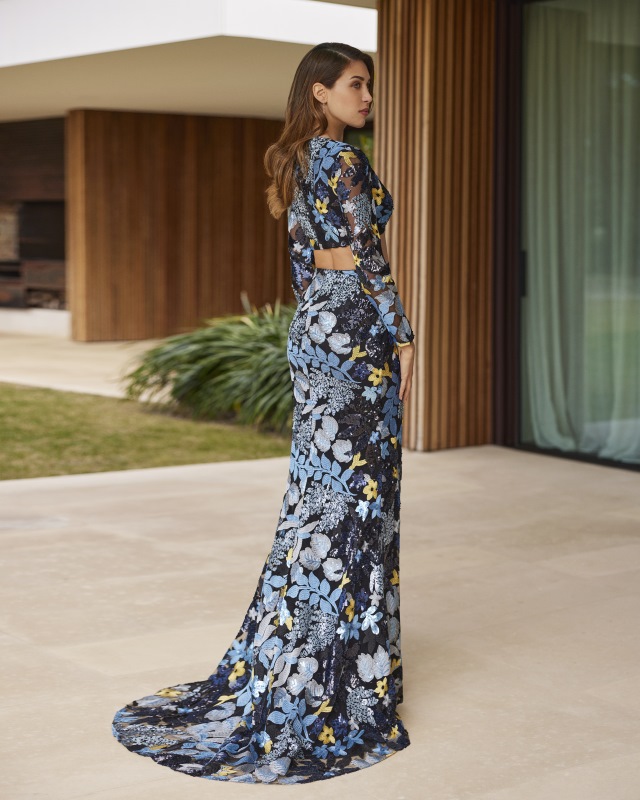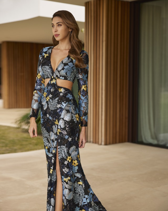 Deslumbrante vestido largo de noche, confeccionado de lentejuelas. Lleva un escote en uve, unas estilosas mangas largas, descubierto en los lados de la cintura hacia la espalda y en la falda una abertura delantera. Un modelo muy elegante y sexy, perfecto para deslumbrar en cualquier acontecimiento. De la firma de MARFIL.