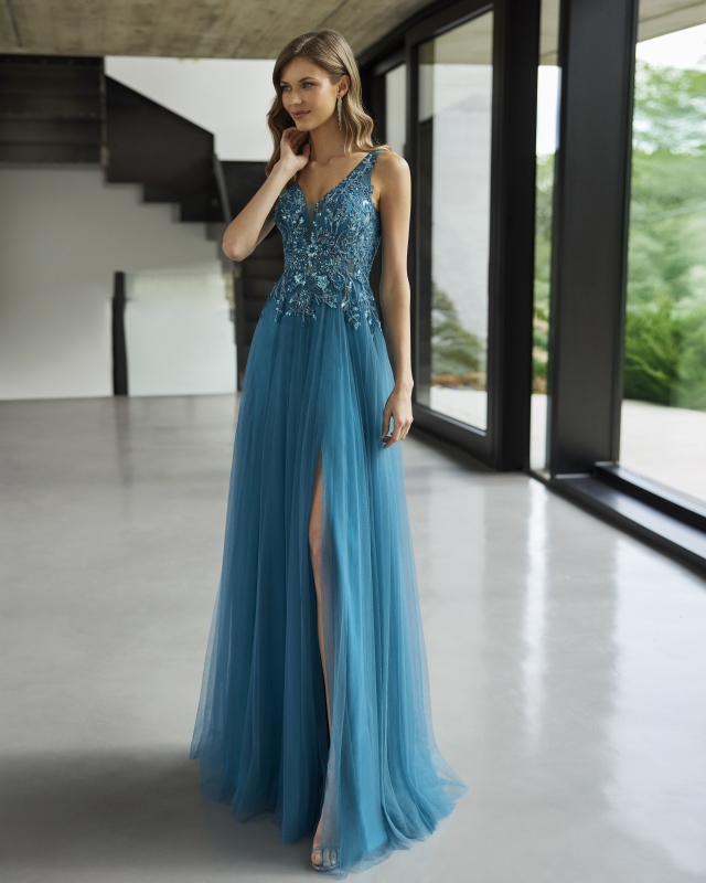 Espectacular vestido largo de fiesta confeccionado en tul, encaje y pedrería. Lleva todo el cuerpo de encaje y pedrería, con escote y espalda en V, tirantes anchos y falda de tul con vuelo. Un modelo con mucho estilo y sofisticación con el que gustarás en cualquier evento. De la firma de MARFIL.