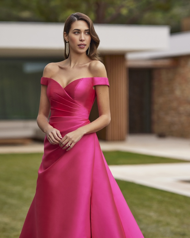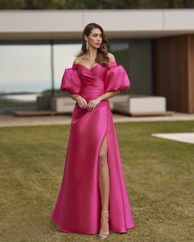 Espectacular vestido largo de fiesta confeccionado en mikado. Lleva un escote de corazón con tirantes anchos dejando descubierto los hombros, unos pliegues que van desde un lateral de la cintura hasta el otro y en la falda de tipo princesa, una abertura lateral; lo acompaña unas mangas cortas abullonadas, que vienen sueltas. Un modelo elegante y distinguido con el que parecerás una princesa en cualquier fiesta. De la firma de MARFIL.