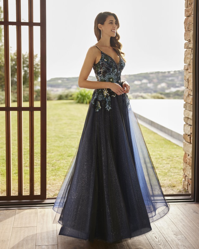 Sensacional vestido largo de fiesta, confeccionado en tul bordado y lentejuelas. Lleva el cuerpo bordado, unos tirantes finos, una falda de capa de tul y todo ello acompañado de una sensacional capa con bordado de lentejuelas. Un modelo lleno de encanto y elegancia, con que no pasarás desapercibida. De la firma de MARFIL.