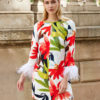Vestido sin entallar estampado con mangas acabadas con plumas