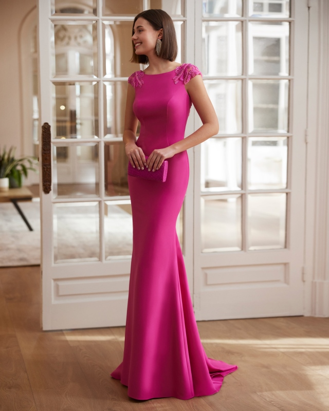 Deslumbrante vestido largo de fiesta confeccionado en crepé elástico y pedrería. Lleva un escote de barco y una espalda abierta tipo joya, ya que desde los hombros y todo alrededor de la espalda tiene pedrería. Su falda es ajustada hasta las rodillas y luego abre hacia su terminación del bajo. Un modelo elegante y juvenil con el que no pasarás desapercibida en cualquier fiesta. De la firma de MARFIL BARCELONA.