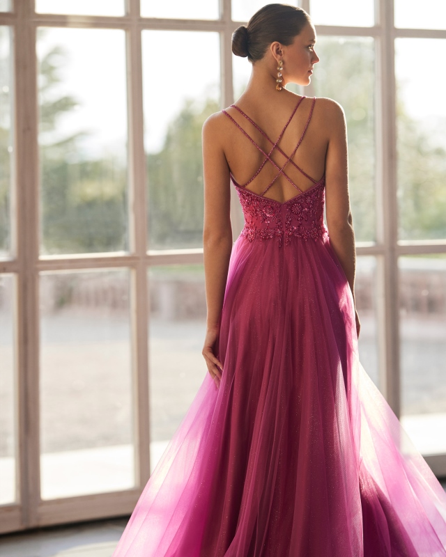 Sensacional vestido largo de fiesta confeccionado de pedrería y tul. Lleva un bonito cuerpo de pedrería con escoteen forma de V, una espalda con tirantes finitos entrelazados entre sí y una falda con vuelo de fantasía con varias capas de tul. Un modelo lleno de encanto y elegancia con el que brillarás como una princesa en el día de tu evento. De la firma de MARFIL BARCELONA.