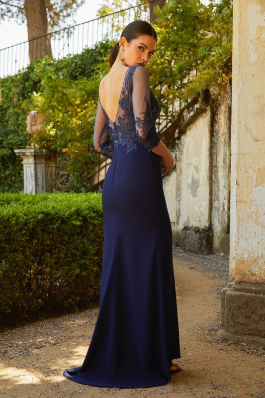 Deslumbrante vestido de falda entallada con abertura lateral, cuerpo de encaje y unas elegantes mangas de tul. Un modelo para ser la protagonista del evento, por su encanto y belleza. De la firma de Alma Couture.