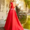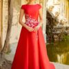 Vestido largo en color liso de Mikado. Leva un moderno bordado, que va desde el cuerpo hasta la falda; una falda de tablas sencilla y actual. De la firma de Alma Couture.