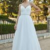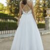 Sencillo vestido en color liso y de gasa, con corpiño de jaretas pequeñas y falda de tul y gasa. Un bonito y asombroso vestido para ser la protagonista, la principal de la fiesta, la novia. De la firma de Alma Couture.