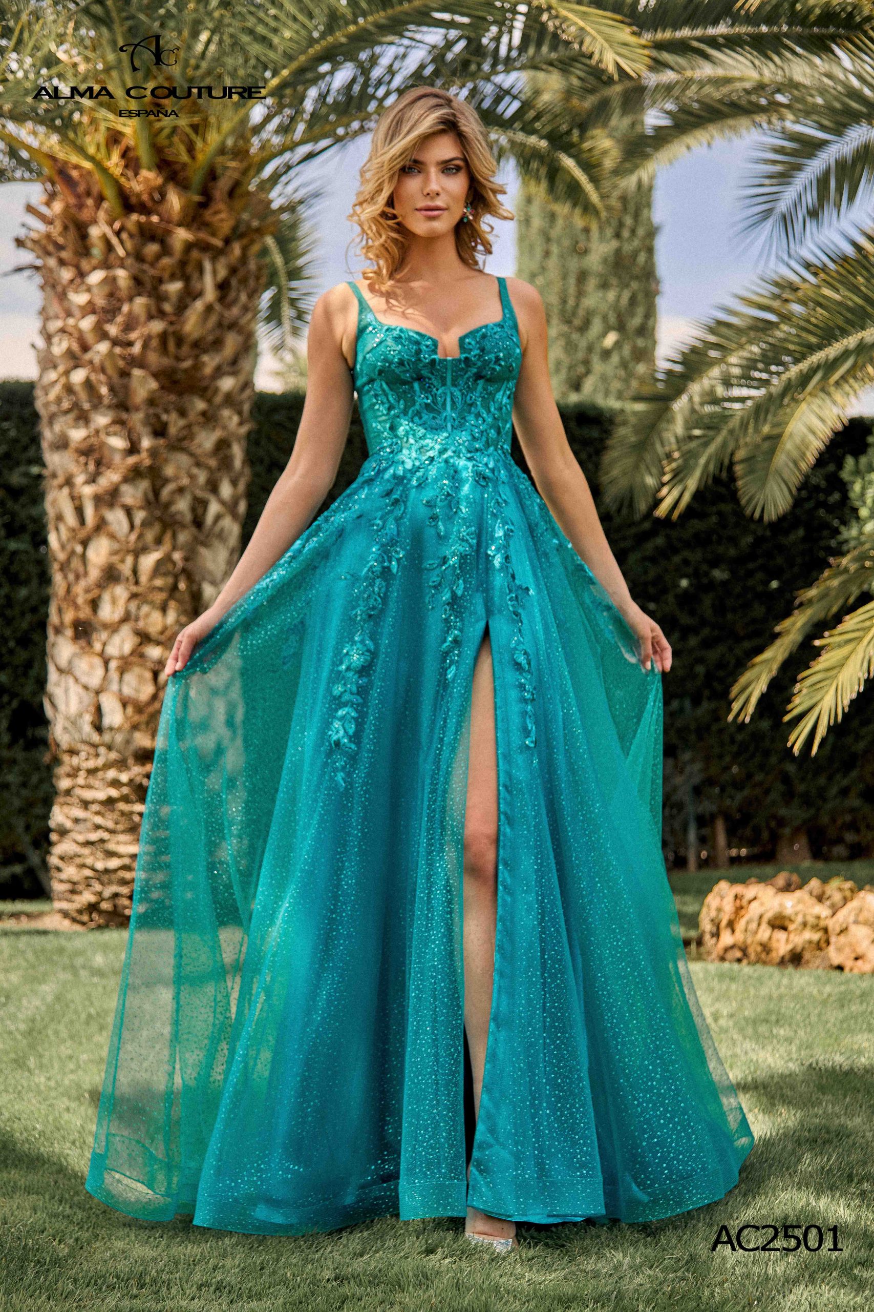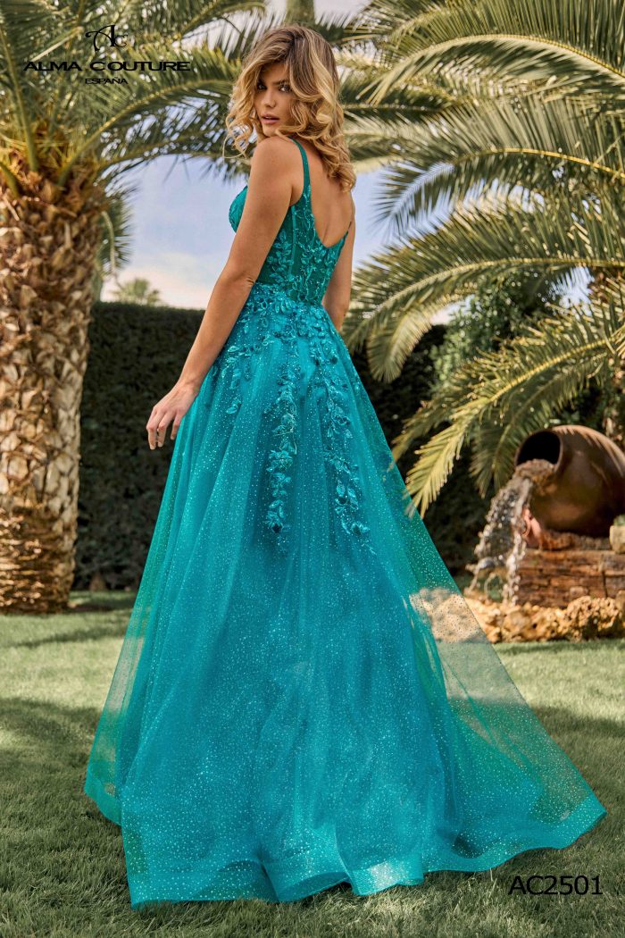 Espectacular vestido largo de fiesta confeccionado en tul bordado y lentejuelas. Lleva un bonito corpiño con ballenas y tirantes finos con espalda media-baja; una falda con vuelo bordada hasta la mitad, con una original abertura en un lateral, desde la mitad del muslo hacia abajo. Un modelo lleno de encanto y estilo para aquellas personas juveniles y con mucha personalidad. De la firma de ALMA COUTURE.