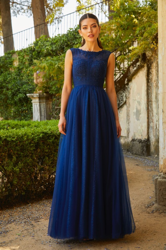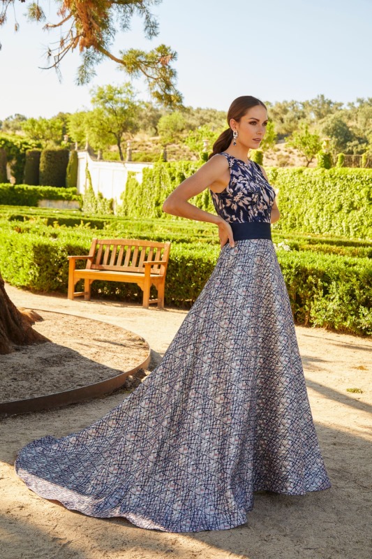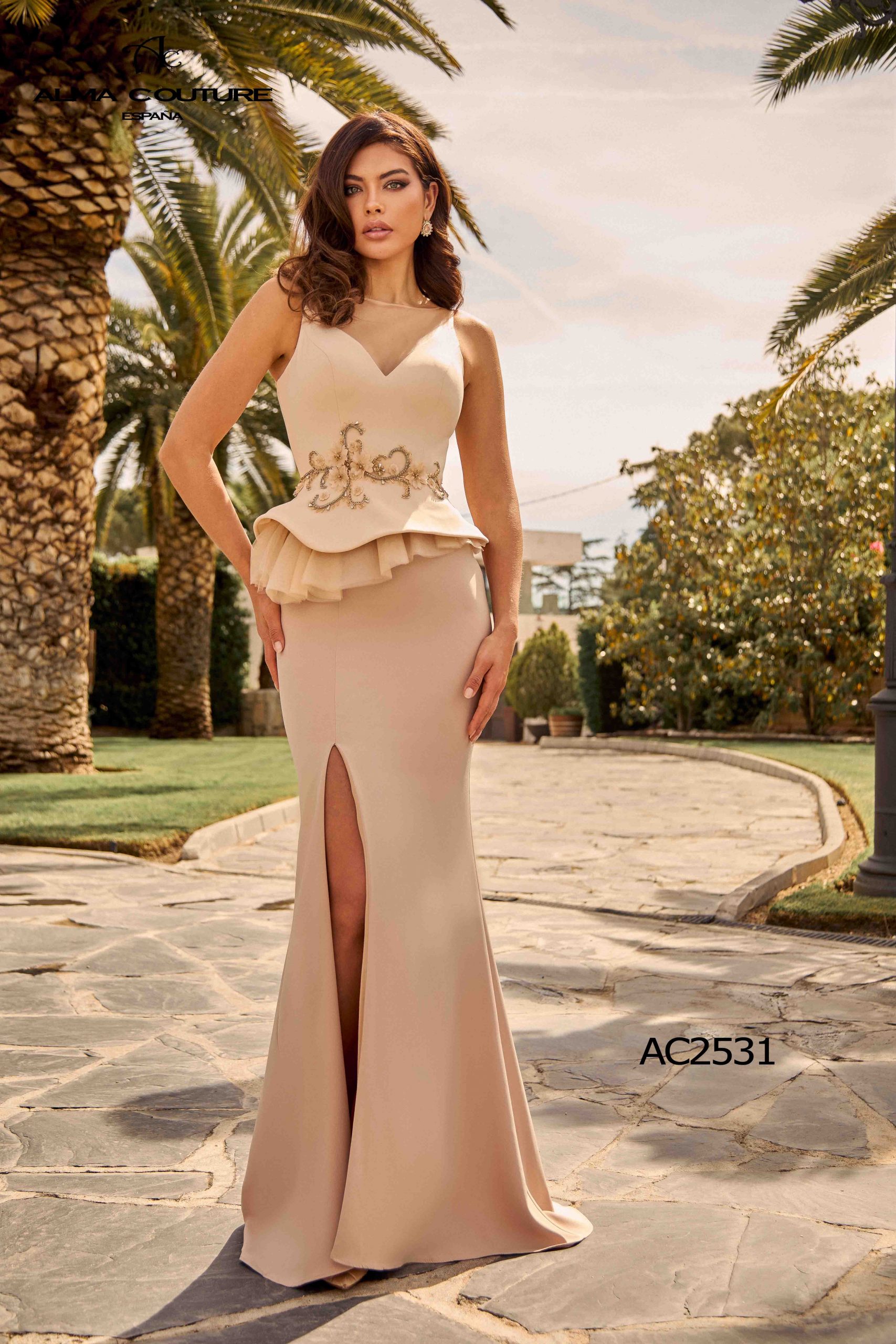 Espectacular vestido largo de madrina confeccionado en crep y tul. Lleva un escote en forma de V tapado con tul hasta el cuello, tirantes anchos y la espalda es mitad transparente y mitad cubierta. Tiene un bordado en la cintura y dos peplum de diferentes tejidos. Su falda es entallada con una sexy abertura lateral. Un modelo lleno de estilo y elegancia con el que destacarás en tu día especial. De la firma de ALMA COUTURE.