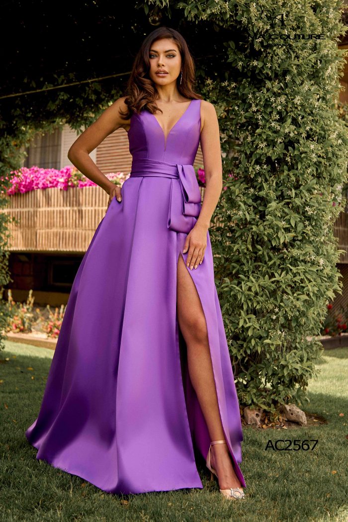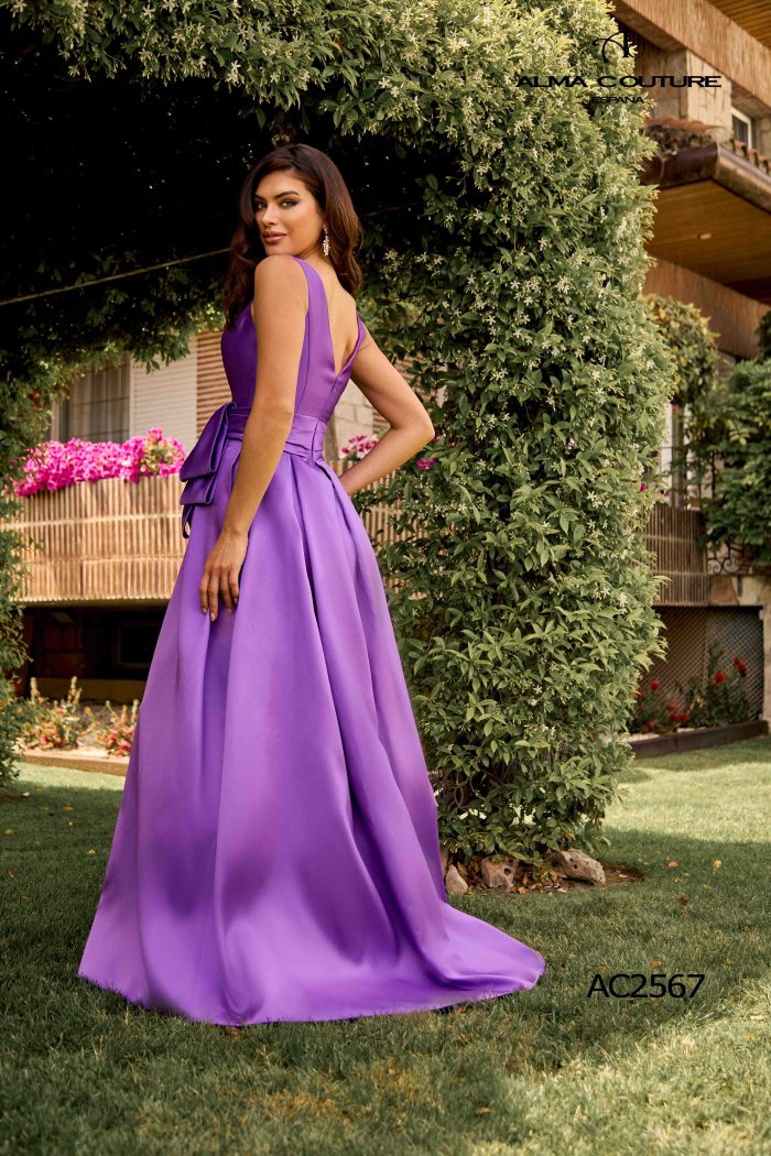 Espectacular vestido largo de fiesta confeccionado en mikado. Lleva un escote en forma de V con tul, unos tirantes anchos y una espalda también en forma de V. En su cintura tiene una original lazada doble, que hace resaltar la silueta.Su falda es de corte princesa con algunas tablas. Un modelo lleno de encanto y elegancia con el que resaltarás en día de tu evento especial. De la firma de ALMA COUTURE.