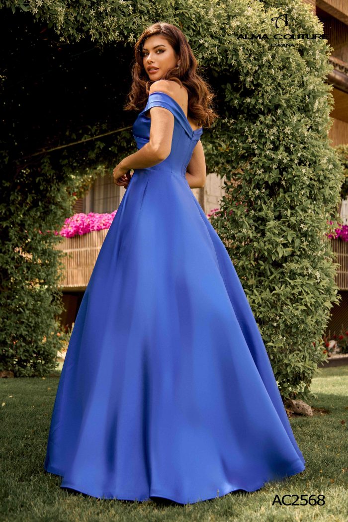Sensacional vestido largo de fiesta confeccionado en mikado. Lleva un bonito escote de corazón con los tirantes caídos al hombro, una espalda en forma de V y unas jaretas muy originales en el cuerpo. Su falda, en forma de A, tiene bolsillos y cola. Un modelo de princesa de cuento de hadas, lleno de encanto y elegancia con el que no pasarás desapercibida el día de tu evento especial. De la firma de ALMA COUTURE.