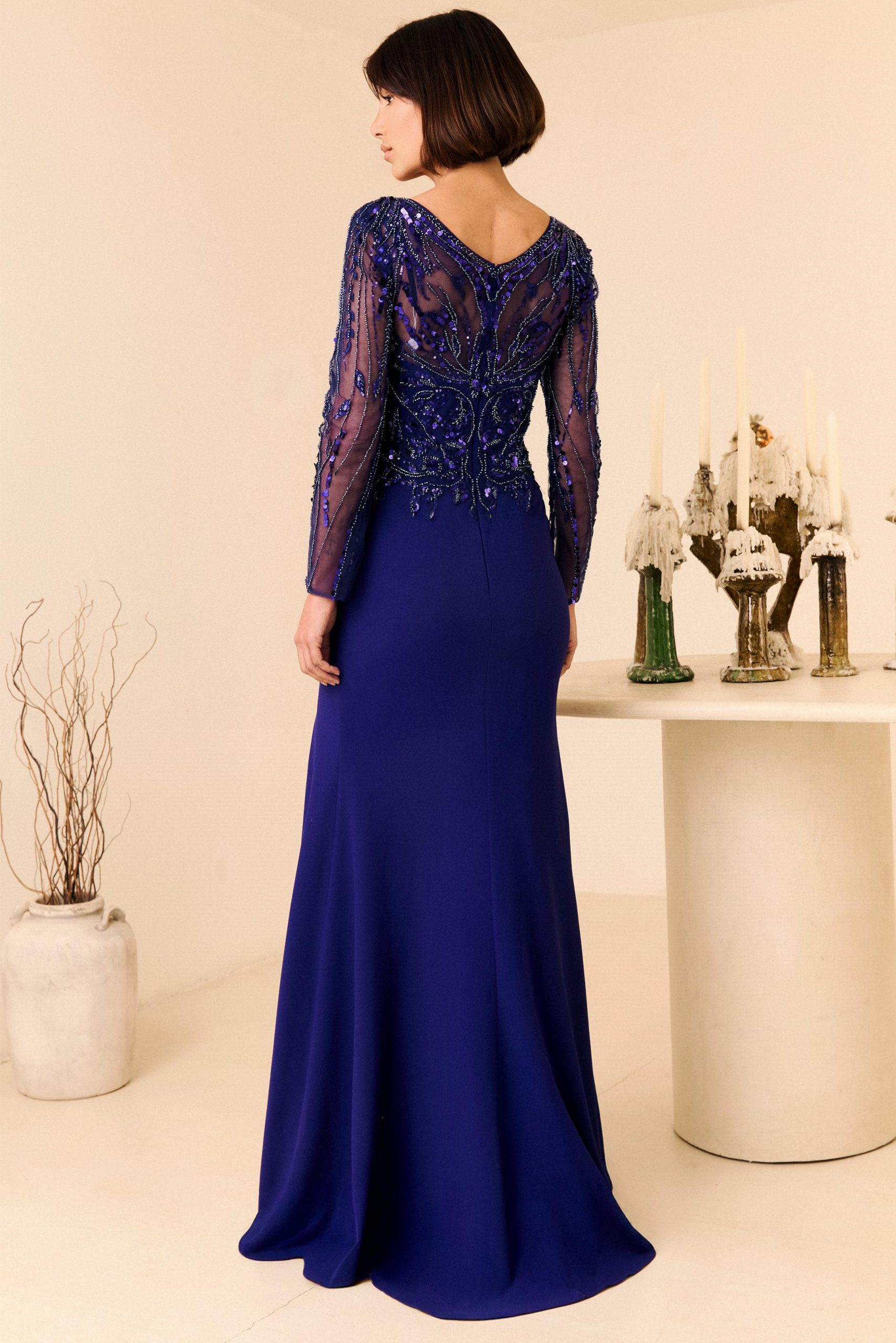 Sensacional vestido de madrina confeccionado en crepé y tul bordado. Lleva un escote y una espalda de pico y unas mangas largas; todo el cuerpo de tul bodado. Su falda es entallada en la cadera haciendo unos pliegues con una abertura en un lateral. Un modelo lleno de encanto y elegancia para aquella madrina estilosa que quiera triunfar en su fiesta. De la firma Española ALMA COUTURE.