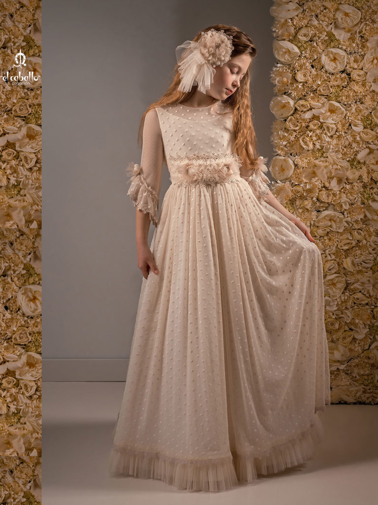 Bonito vestido de comunión de tul con bodoques. Lleva un escote de barco y su mangas francesas llevan un volante con una puntilla; en ell fajín y en la terminación de la falda, también lleva esa misma puntilla. De la firma de EL CABALLO.