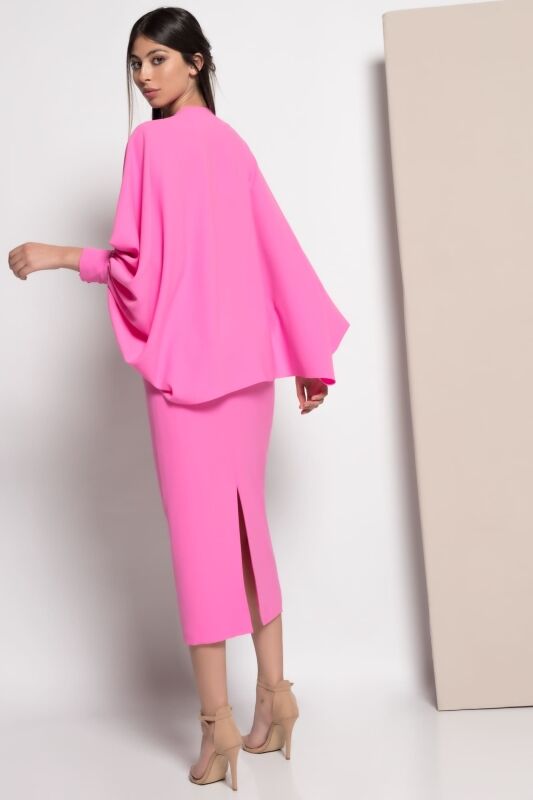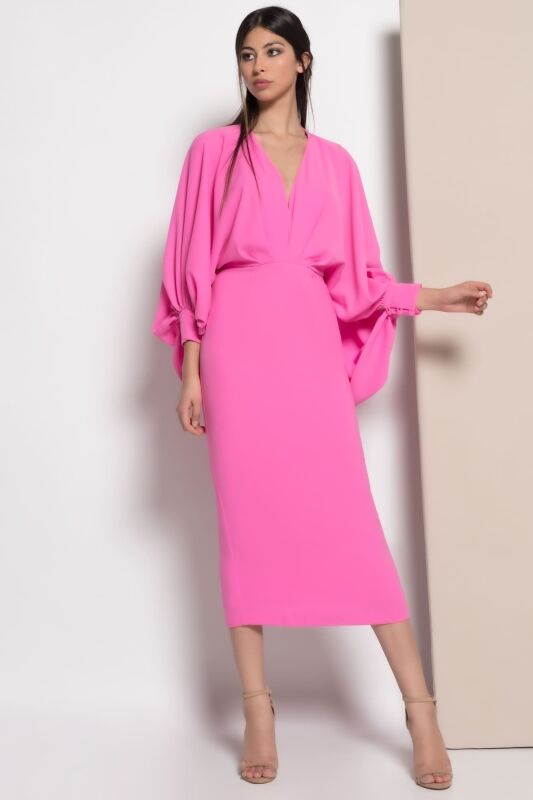 Elegante vestido midi en líneas rectas, con un escote de pico. Lleva unas mangas super originales, tipo capa, muy estilosas y de tendencia. Es un modelo ideal, para no pasar desapercibida en cualquier evento. De la firma de MATILDE CANO.