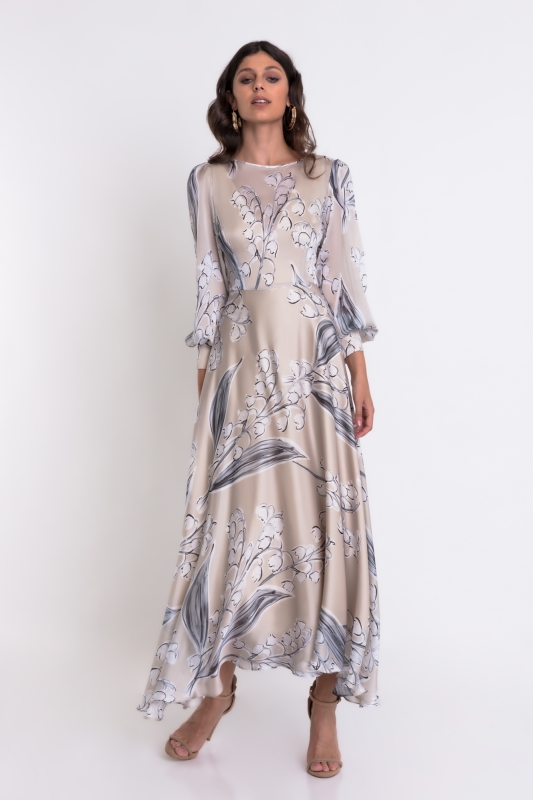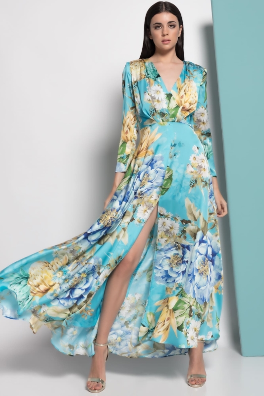 Vestido largo de satén y estampado floral. Lleva un bonito escote de pico y una abertura central, en la falda. Un modelo elegante y sencillo para cualquier evento de fiesta. De la firma de MATILDE CANO.