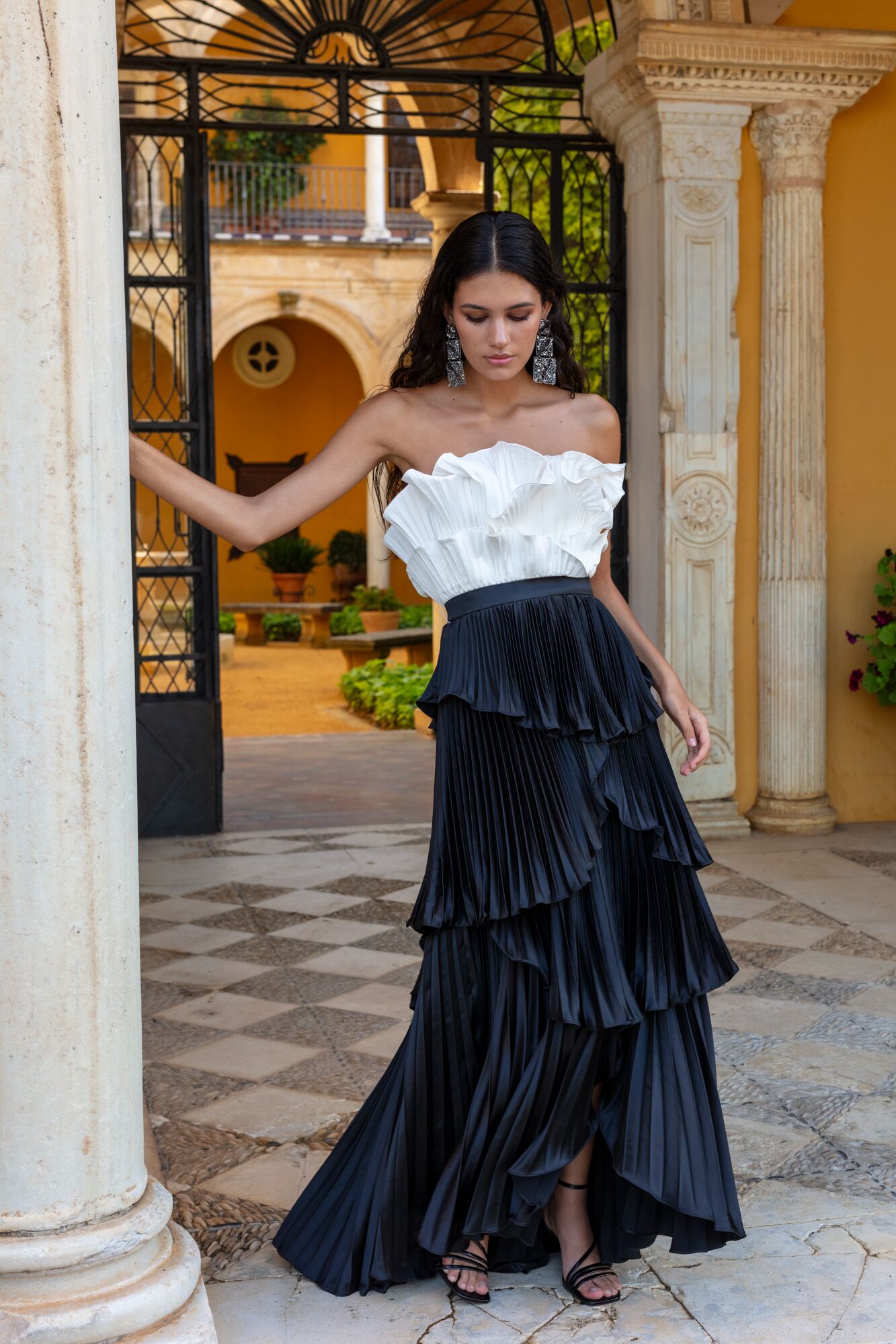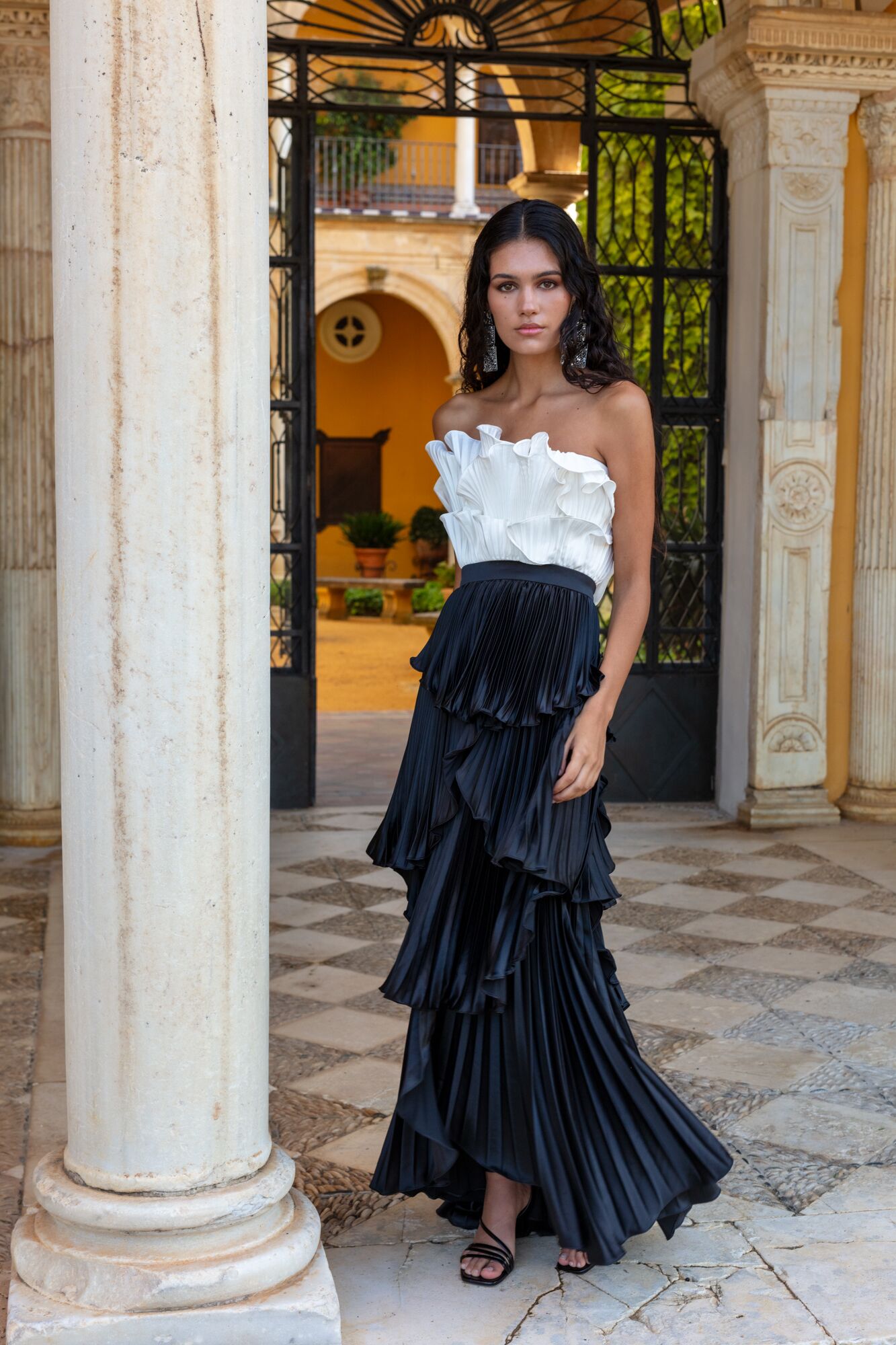 Sensacional vestido largo de fiesta confeccionado en satén. Lleva un cuerpo de palabra de honor sin tirantes adornado con volantes plisados en color marfil. Su falda con un largo asimétrico se compone de capas de volantes plisados en negro. Un modelo juvenil y elegante con el que se fusiona el volumen, ideal para invitadas ce boda, galas o cenas formales. De la firma Española MATILDE CANO.