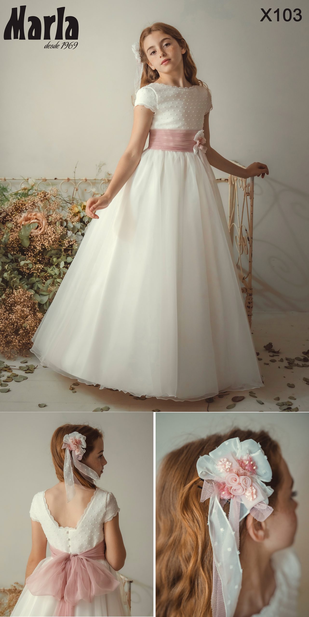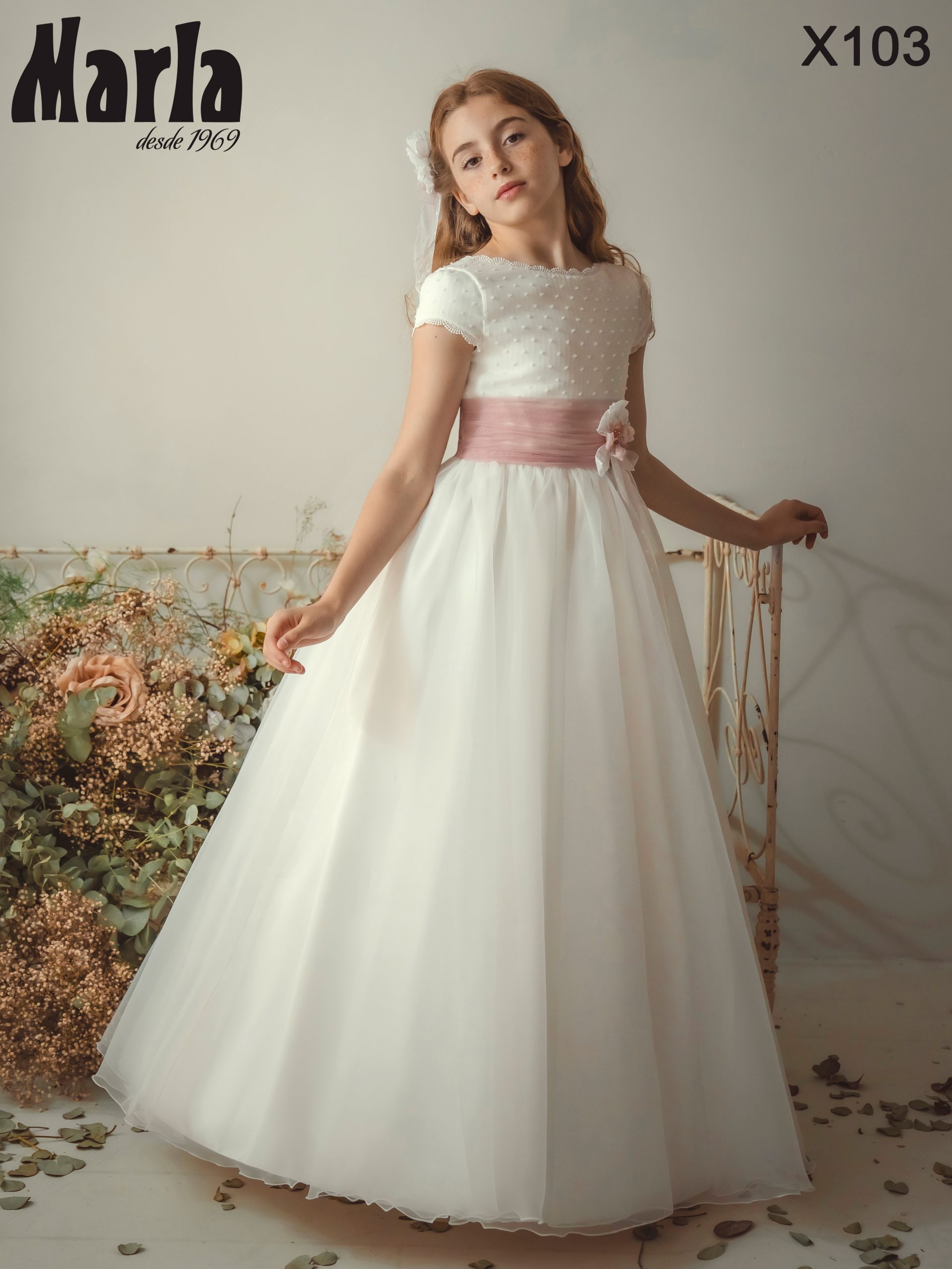 Sensacional vestido de comunión confeccionado en tul bordado y gasa. Su cuerpo es de tul bordado con un escote de barco, con una mangas cortas y con una pequeña y bonita puntilla en la terminación del escote y la manga. Su falda es toda ella de capa en gasa. Un modelo lleno de encanto y elegancia con el que nuestras princesas disfrutarán en el día de su primera comunión. De la firma Española de MARLA.