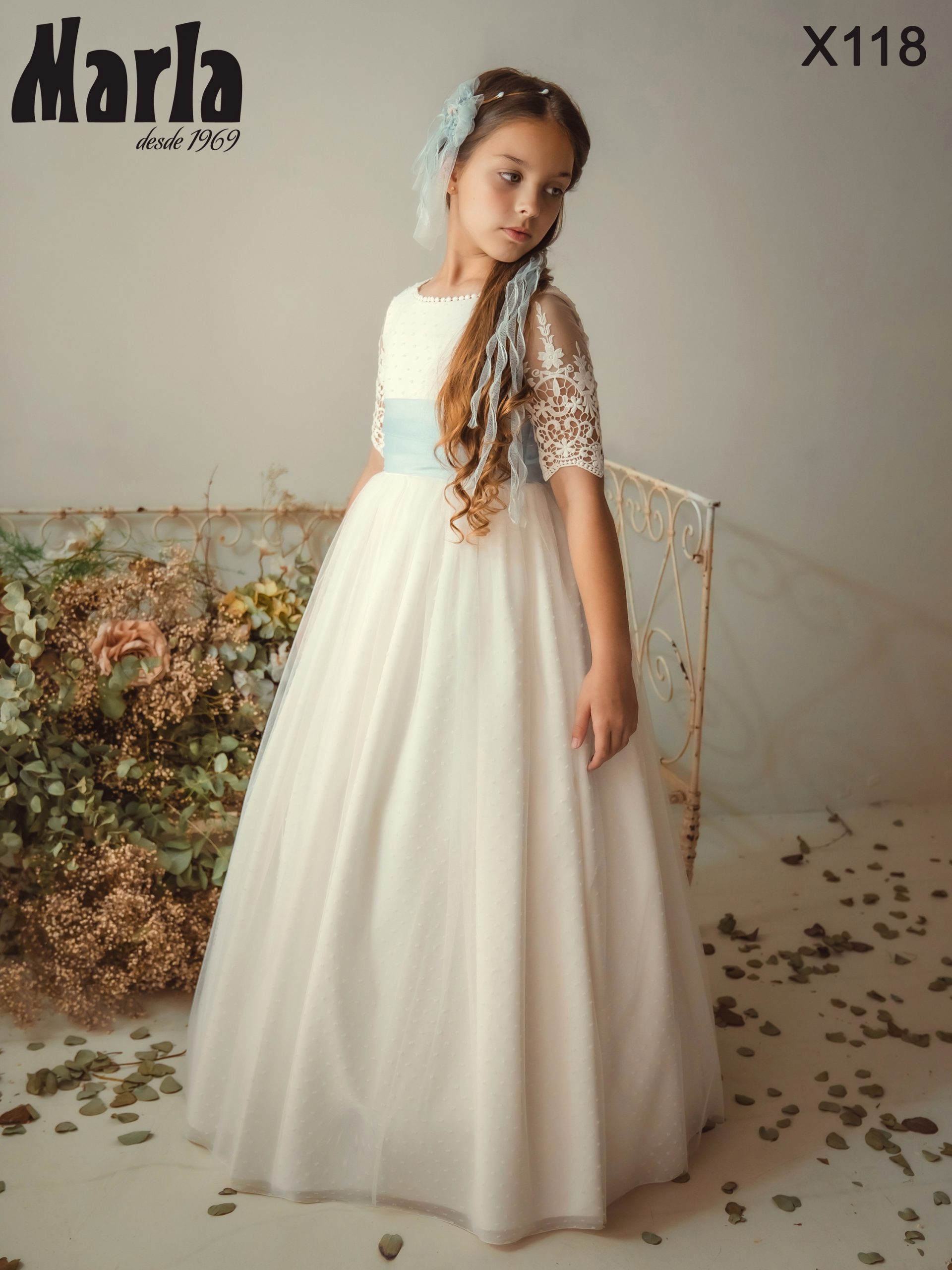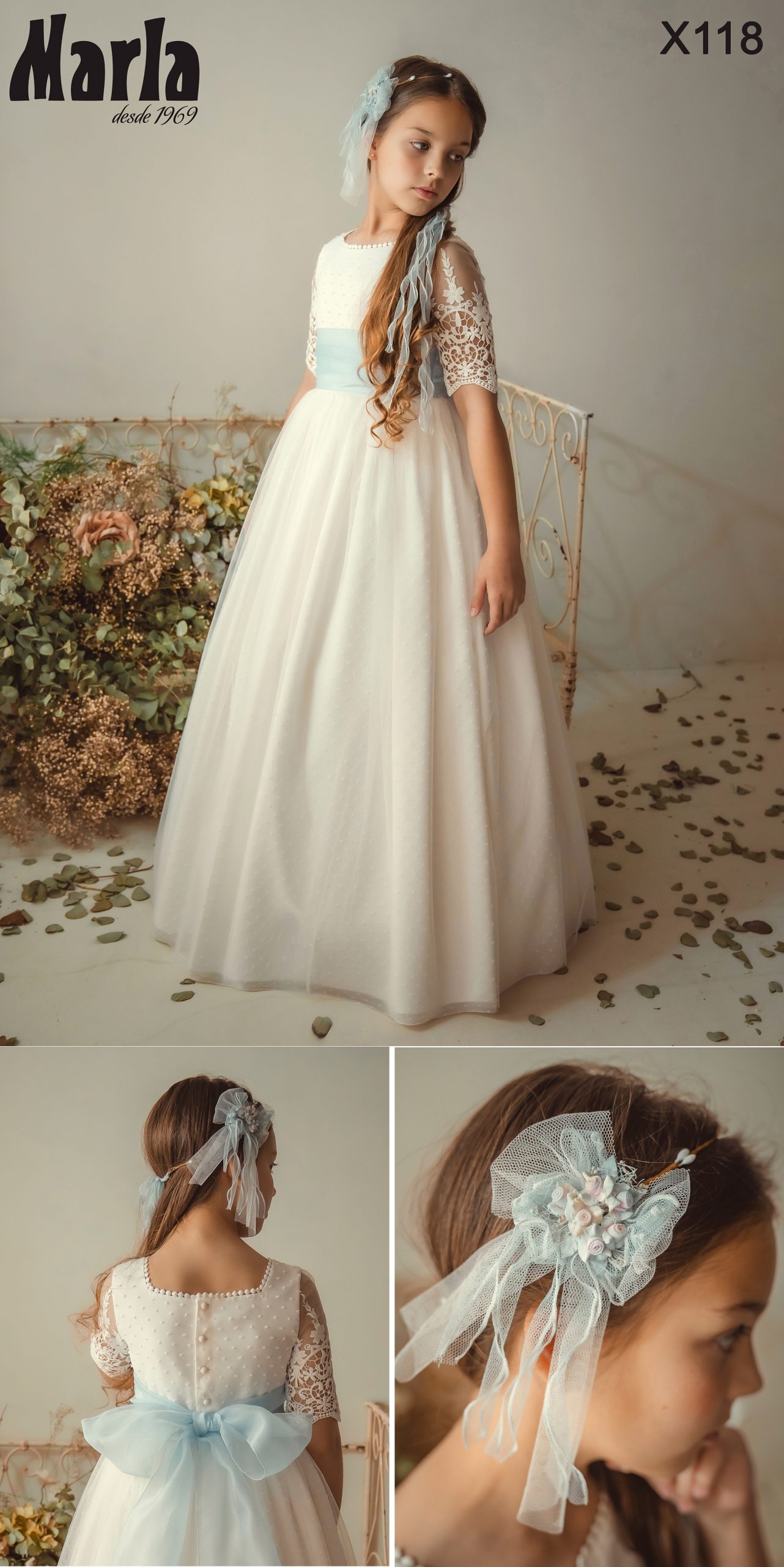 Fantástico vestido de comunión, confeccionado en tul bordado. Lleva un bonito escote y espalda cuadrada, con unas bolitas de pasamanería en su terminación. Sus mangas francesas son de tul con blonda, su falda es de tul bordada y el fajín de seda rústica en color azul. Un modelo fino y elegante con el que nuestras princesas resaltarán muy botitas, en el día de su Primera Comunión. De la firma Española de MARLA.