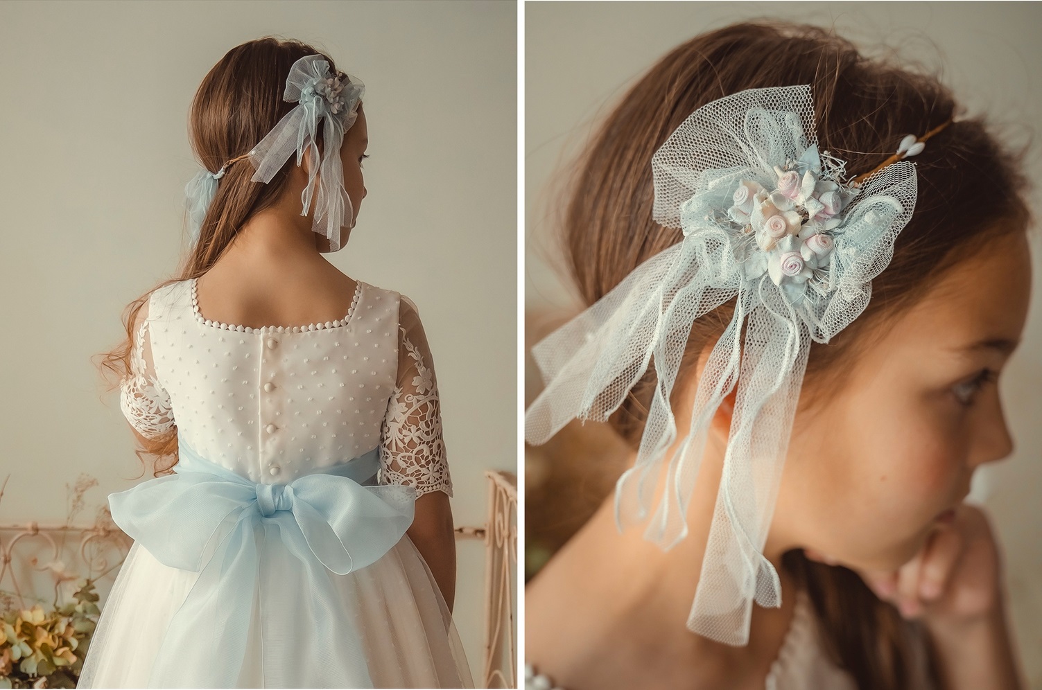 Estiloso prendido de comunión confeccionado en tul. Lleva un lazo con caídas y unas florecitas en el centro de diferentes tamaños y colores todo en la tonalidad del fajín de su vestido a juego. Un modelo sencillo y elegante que lleva una peineta para que se enganche con facilidad en el pelo. De la firma Española de MARLA.