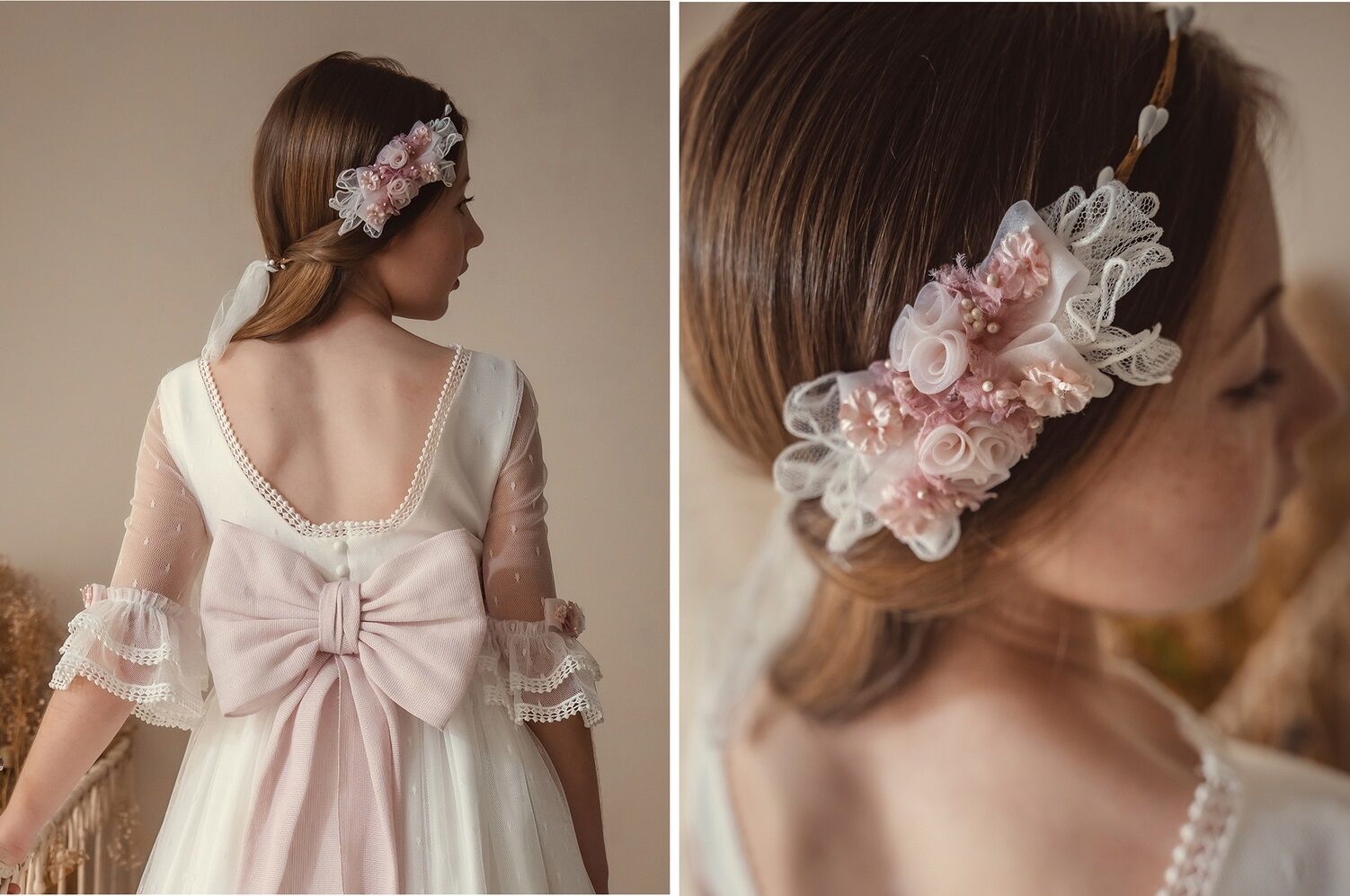 Espectacular prendido de comunión confeccionado en tul y gasa cristal.Lleva un lazo de gasa cristal con caídas en tul y unas florecitas de diferentes modelos, tamaños y colores todo en la tonalidad del fajín de su vestido a juego. Un modelo sencillo y elegante que lleva una peineta para que se enganche con facilidad en el pelo. De la firma Española de MARLA.
