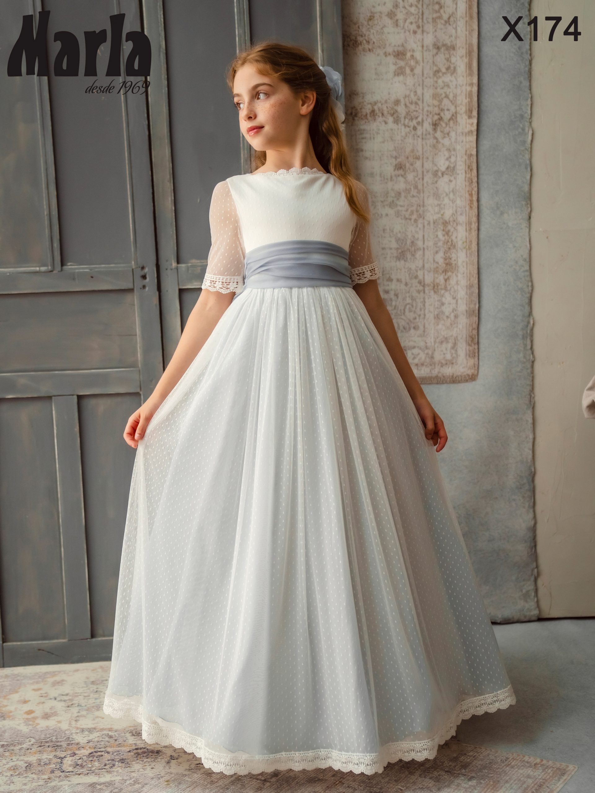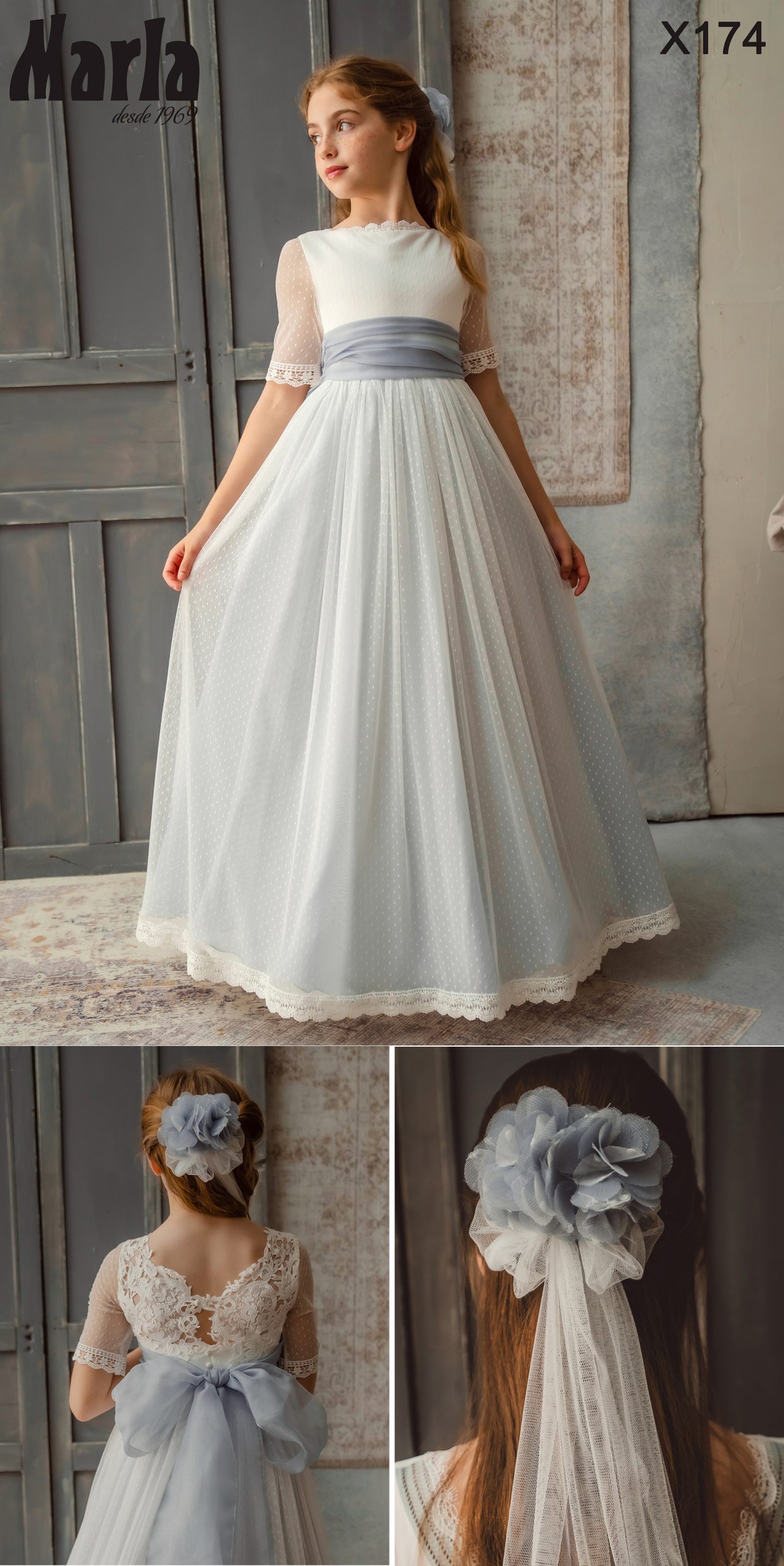 Asombroso vestido de comunión confeccionado en tul de topos. Lleva un escote de cuello de barco con una puntilla en su terminación; su espalda es abierta toda de blonda y sus mangas francesas ajustadas de tul de topos. Su falda de vuelo tiene en su terminación una sencilla puntilla y un forro igual que su fajín en tono azul grisáceo. Un modelo que forma el look perfecto para aquella princesa fantástica y elegante. De la firma Española de MARLA.