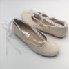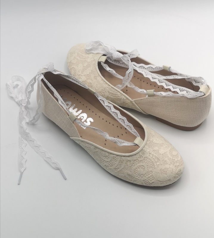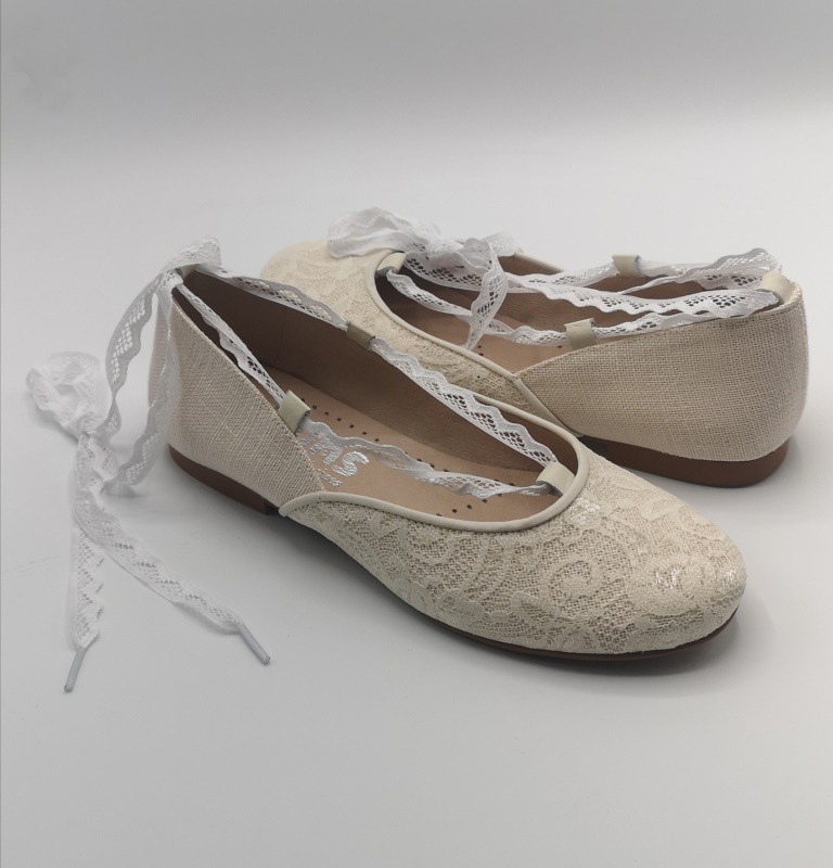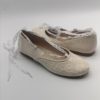Zapato encaje lino beige atado en forma romana en la pierna de YOWAS. El piso es muy confortable.