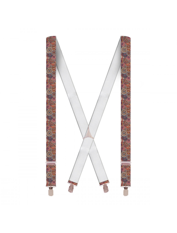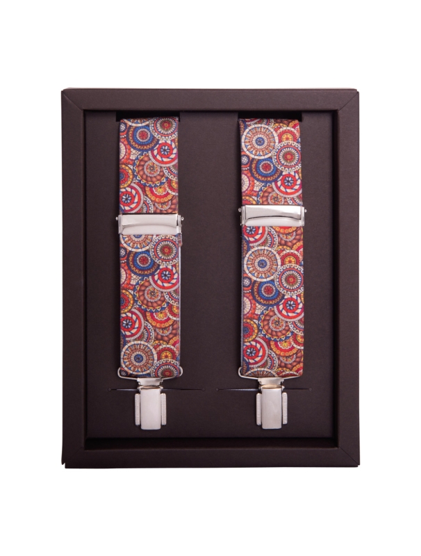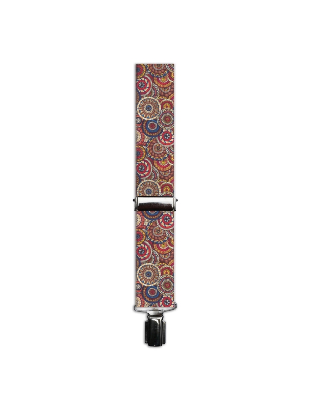 Tirante elástico en negro con dibujos de mandalas en rojo, naranja y azul.
