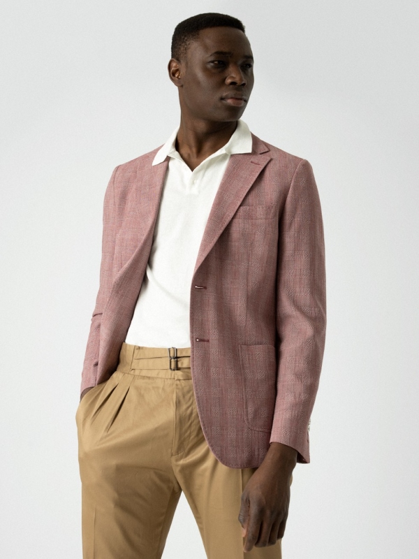 Solapa de muesca, bolsillos con solapa y cerillera, ribete en pecho, cierre mediante dos botones frontales. Dos aberturas en la espalda, puño de manga con cuatro botones montados, forro y bolsillos interiores.