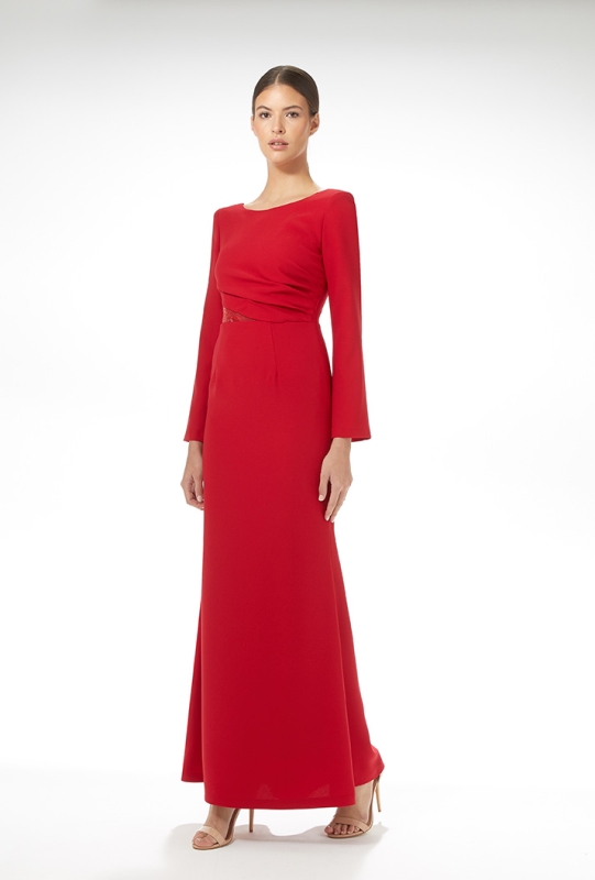 Bonito vestido largo en color liso, confeccionado en crepe. Lleva una aplicación de swarovski en un lateral de la cintura y unas jaretas, en el otro. Un elegantísimo modelo, lleno de encanto y sencillez. De la firma de CARLA RUIZ.