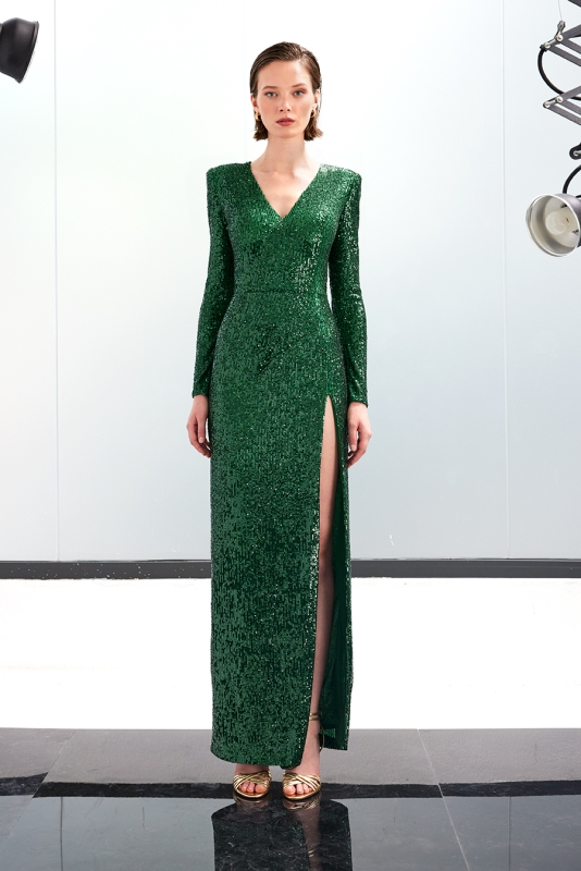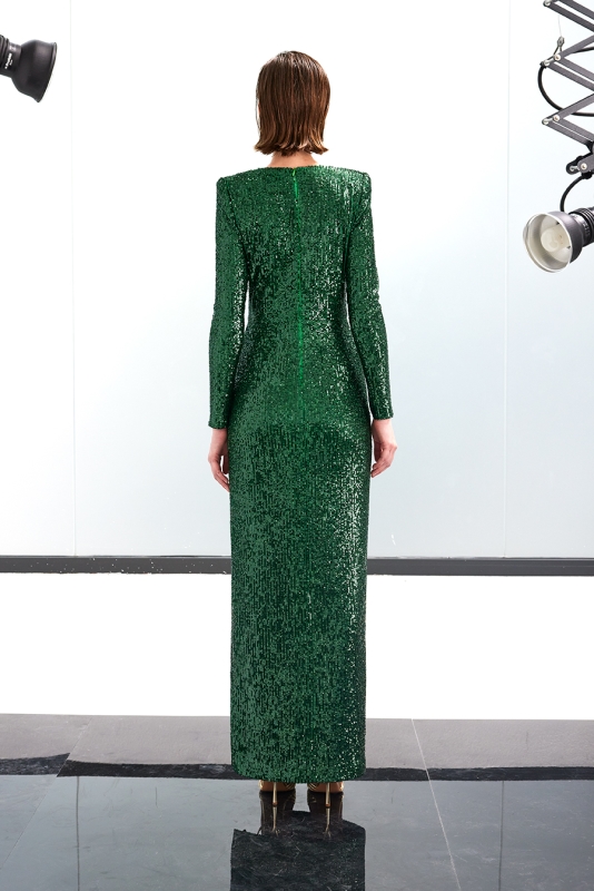 Espectacular vestido largo de lentejuelas, confeccionado en un tejido elástico llamado payes. Lleva un escote amplio de pico, unas mangas largas y una abertura lateral en la falda. Un modelo sofisticado y moderno, especial para ti. De la firma de CARLA RUIZ.