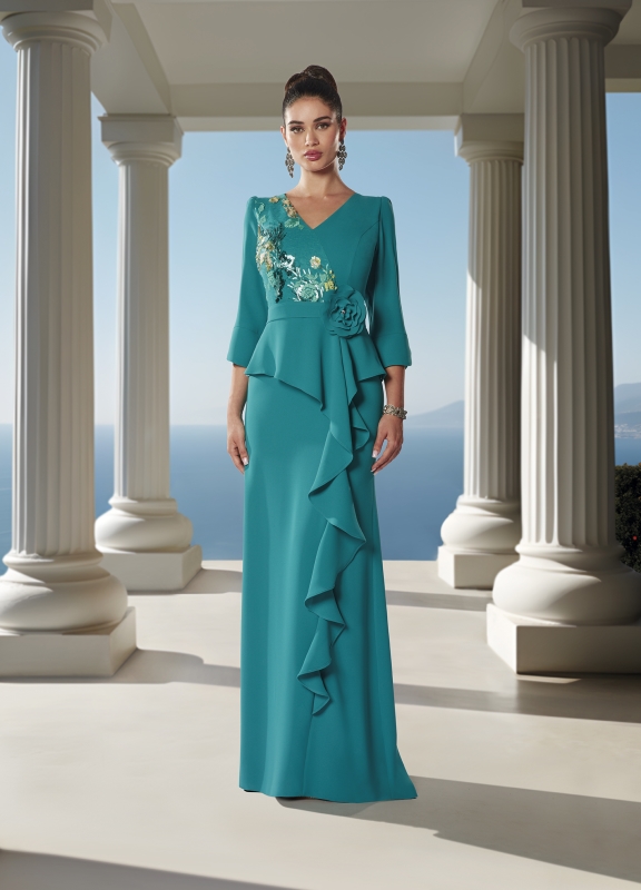 Sensacional vestido largo de madrina, confeccionado en crepe y blonda. Lleva un original cuerpo mitad en crepe y mitad en blonda, un cinturón con una flor y un peplum en la cintura que cae en cherrera hacia lo largo del vestido. Un modelo sencillo y original con el que destacarás en tu evento. De la firma de NATI JIMÉNEZ.