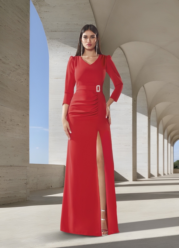 Sensacional vestido largo de fiesta confeccionado en un crepé. Lleva unas bonitas mangas francesas, escote de pico, falda con una abertura lateral y en ella, un rizado muy juvenil y divertido. Un modelo sencillo y sexy para cualquier evento. De la firma de NATI JIMÉNEZ.