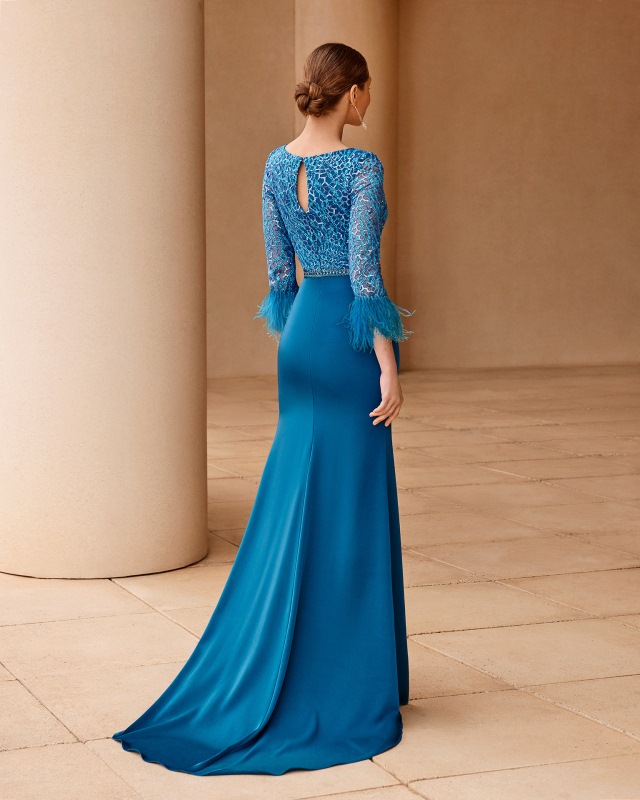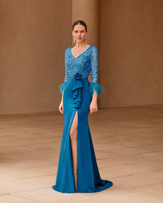 Espectacular vestido largo de madrina en satén, con el cuerpo bordado y con pedrería. Lleva un escote de pico y unas mangas francesas con unas originales plumas. La falda lleva una abertura lateral con un moderno volante. Un modelo ideal para destacar en cualquier evento. De la firma de MARFIL.