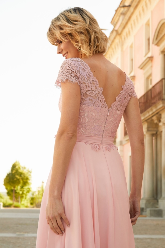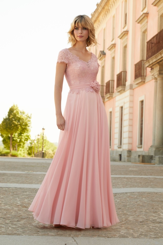 Vestido gasa de cuerpo bordado, con escote en forma de U. Lleva un singular cinturon en liso, con una flor en tela, muy apropiado al modelo. De la firma de XYM.