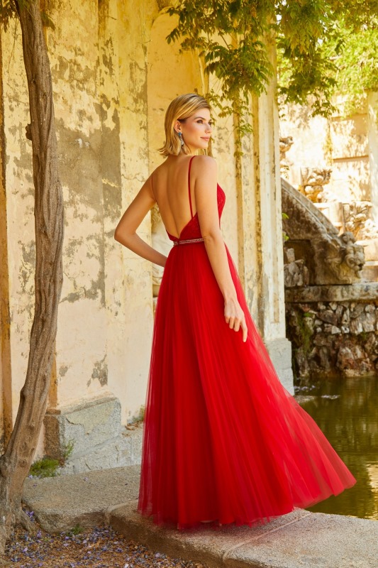 Impresionante vestido de tul, con un cuerpo de tul y blonda muy sencillo y original. Lleva un tirante finito hasta la espalda y un original cinturón de piedrecitas brillantes. Un modelo que brilla por su sencillez y elegancia. De la firma de Alma Couture.