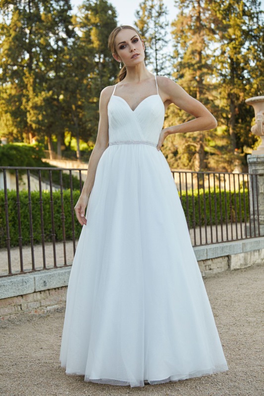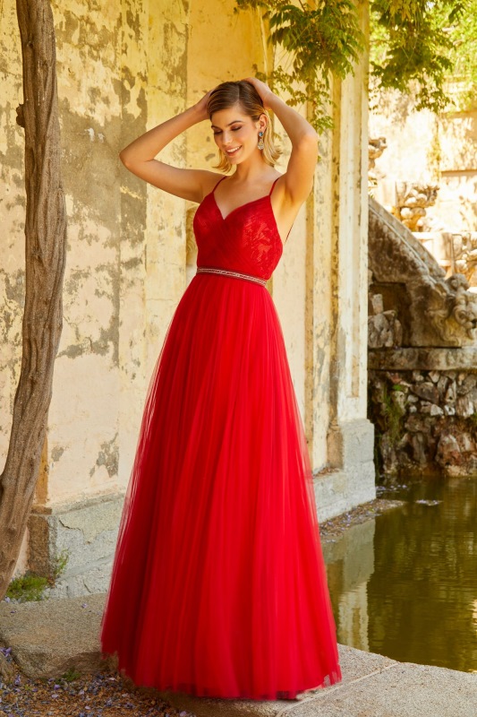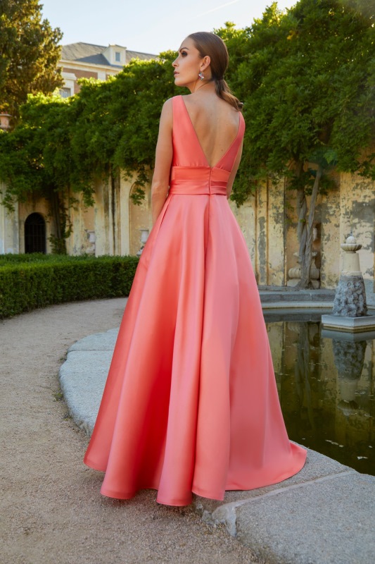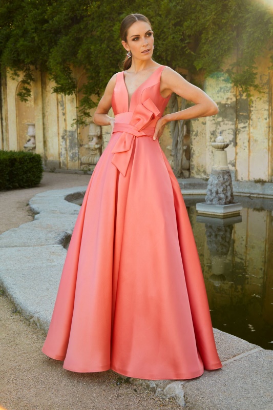 Sencillo vestido largo de Mikado de corte princesa. Lleva un sensual escote de pico y una lazada doble en cintura, que hace resaltar la silueta. De la firma de ALMA COUTURE.